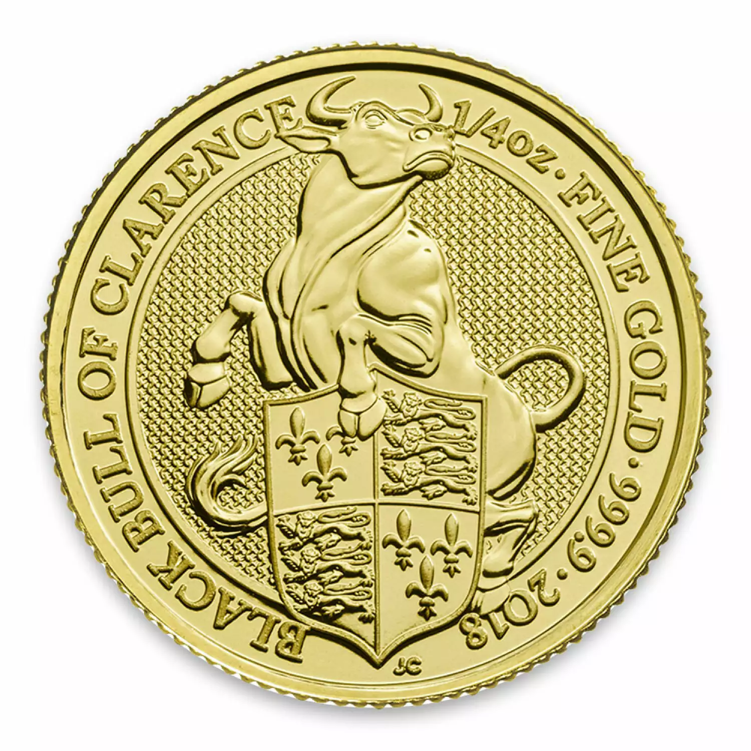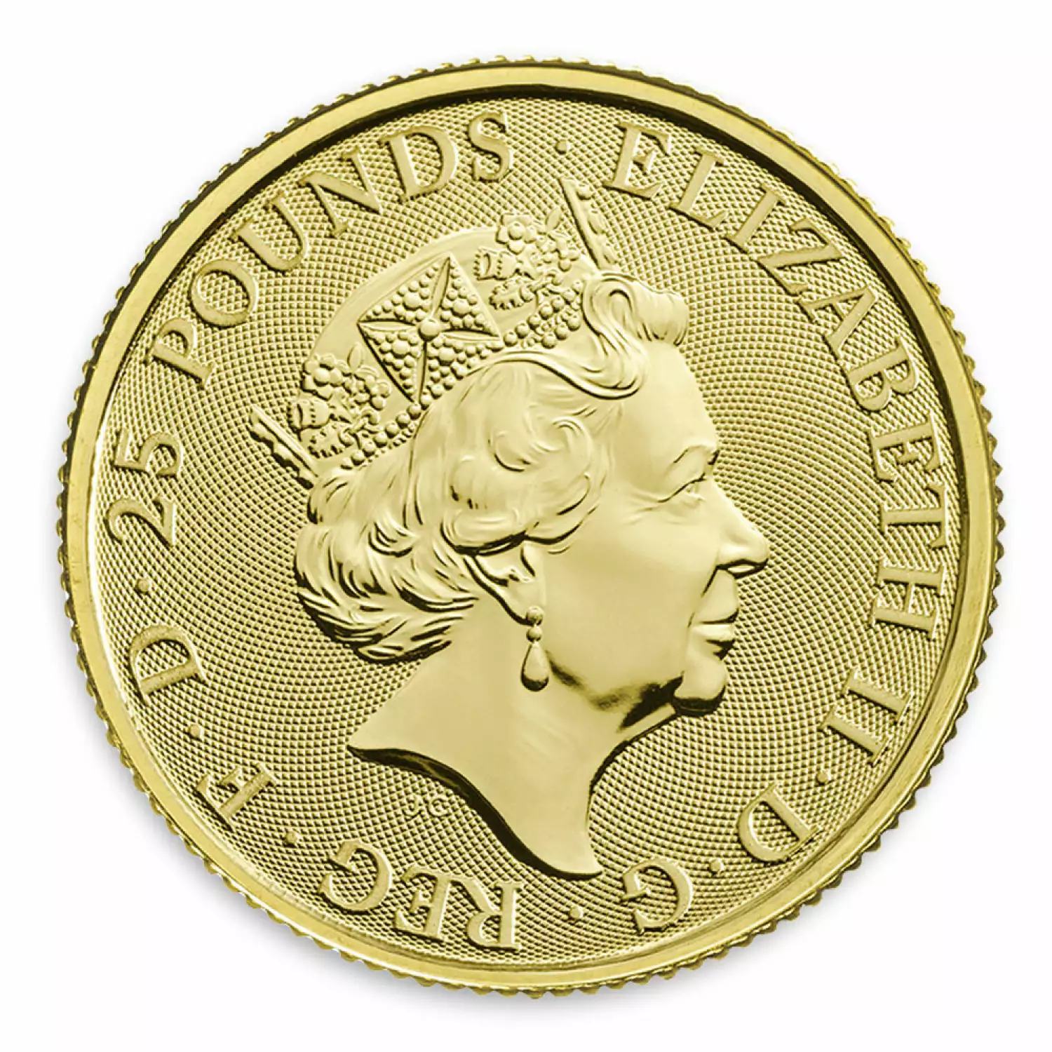 The 1/4oz 2020 Britain Queen's Beasts: The White Lion of Mortimer is the first release in an exciting new 10 coin series. The Britain Queen's Beasts celebrate the British Monarch and the centuries of fascinating heraldry. This gold coin contains 1/4 oz of .9999 fine Gold. The reverse, designed by Jody Clark, depicts a lion holding a shield with a rose on it, the symbol of York, along with the sun rays which symbolised good luck in the battles.