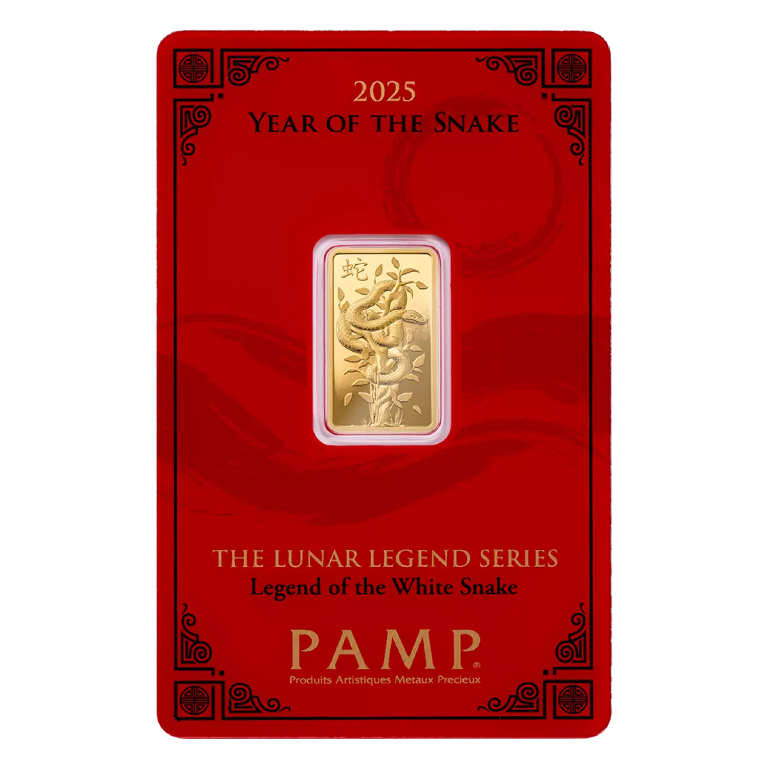 The 2025 5g PAMP Gold Bar - Year of the Snake is a stunning addition to any precious metal collection. This exquisite bar is part of PAMP's renowned Lunar Calendar series, which celebrates the ancient Chinese zodiac. Each bar is meticulously crafted to showcase theSnake, a symbol of renewal and transformation in Chinese culture.