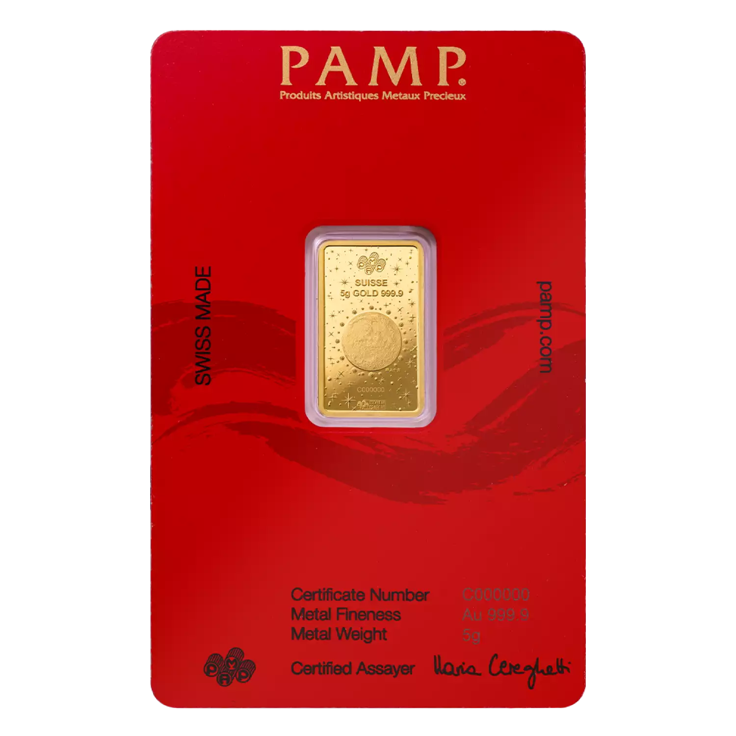 This 5g gold bar is struck from 99.99% pure gold and features an impressive design, complete with intricate details and a rich, golden hue. The obverse side of the bar bears theSnake design, while the reverse side displays the PAMP logo, weight, and purity.