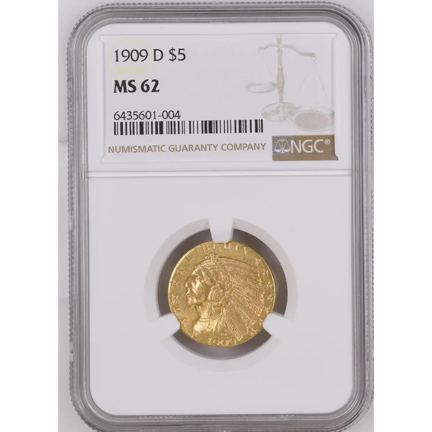 1909-D Gold Half Eagles $5 Indian Head NGC MS-62