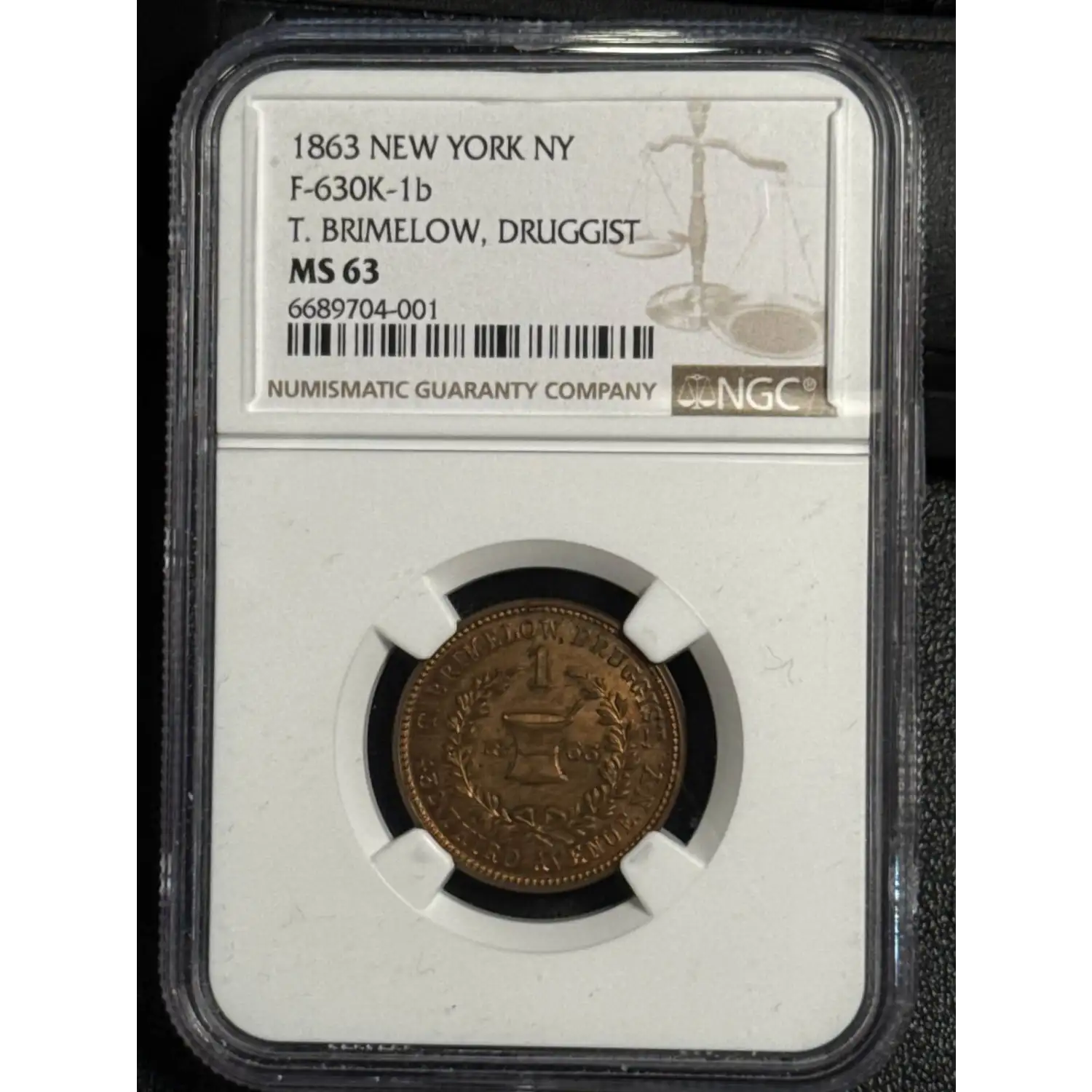 1863 Pvt Tokens - Civil War Tokens New York NGC MS-63 F-630K-1b T. BRIMELOW, DRUGGIST
