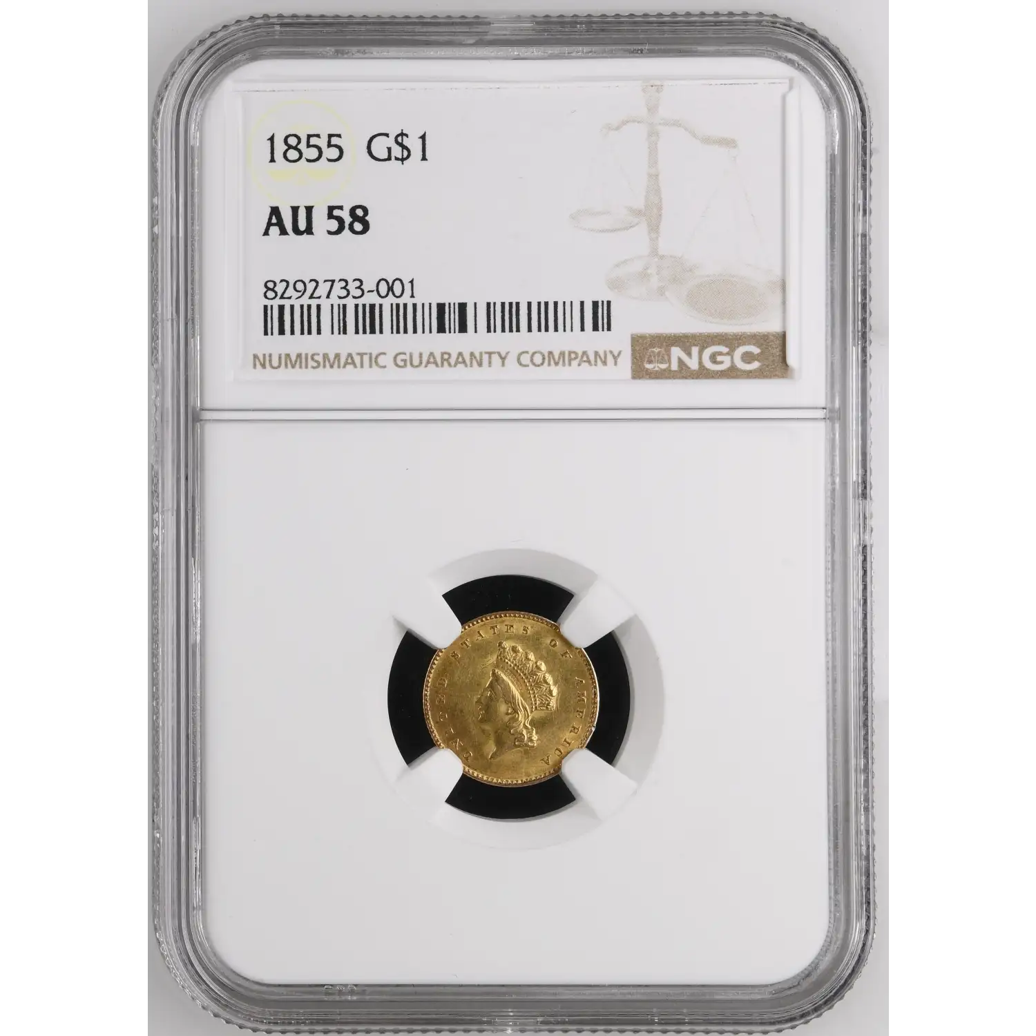 1855 Gold Dollars Indian Princess Head, Small Head NGC AU-58 CAC