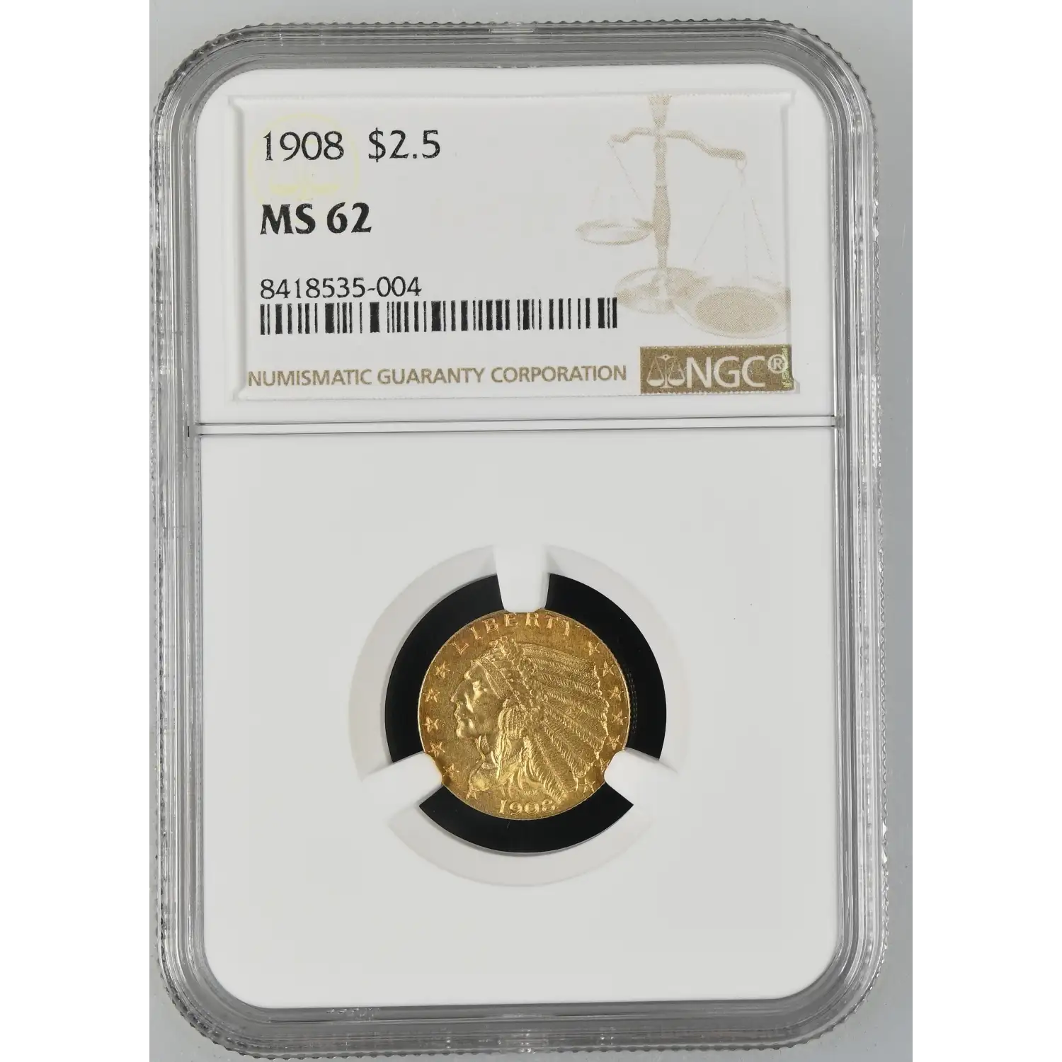1908 Gold Quarter Eagles $2 1/2 Indian Head NGC MS-62