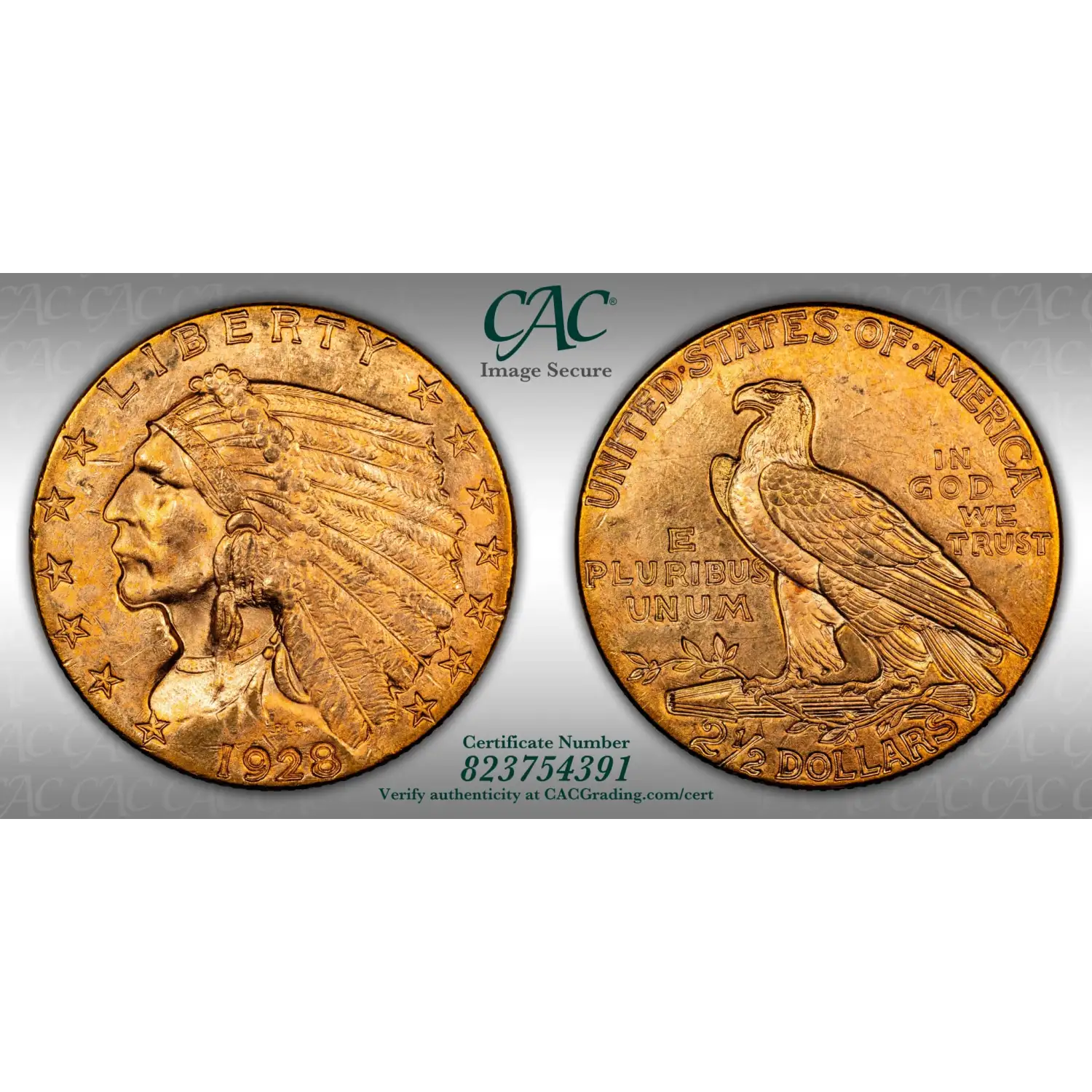 1928 Gold Quarter Eagles $2 1/2 Indian Head CACG MS 62 CAC