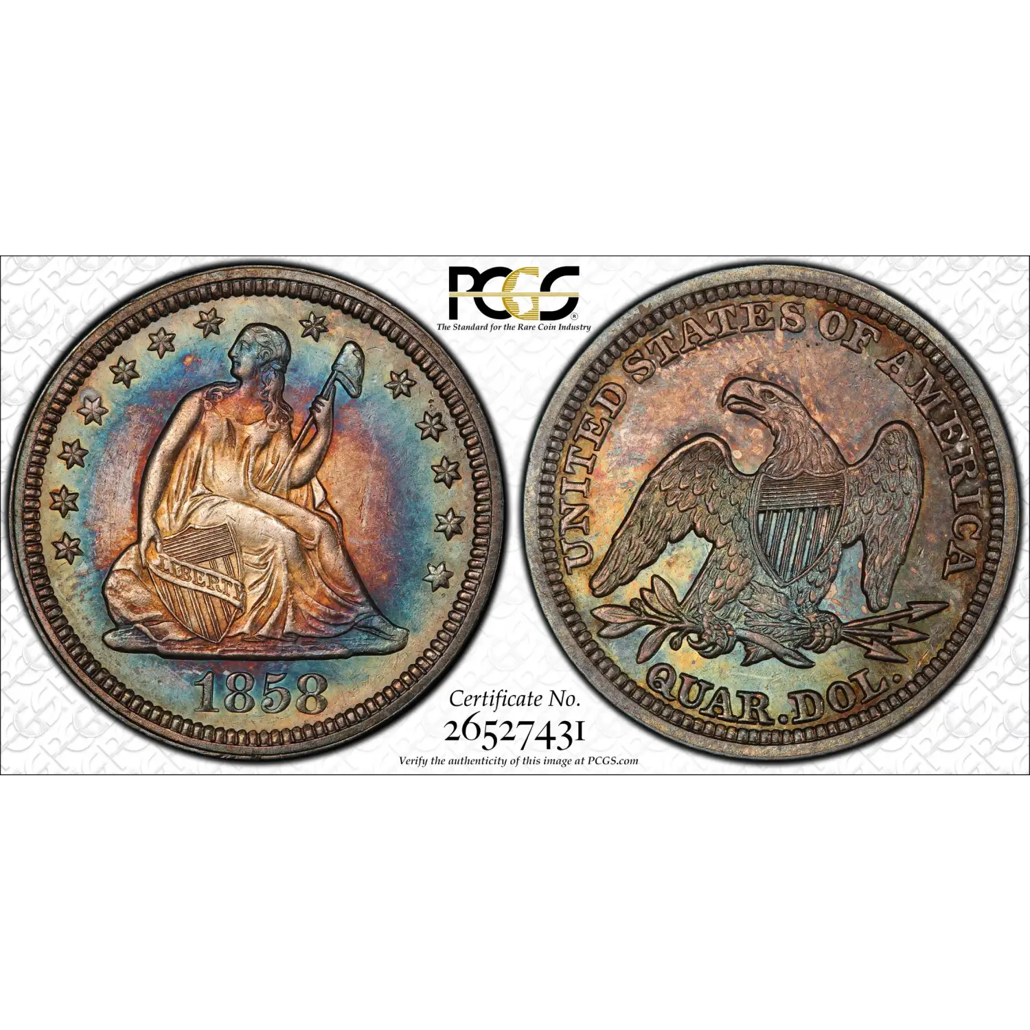1858 Seated Liberty Quarter PCGS MS-62 BEAUTIFUL TONING
