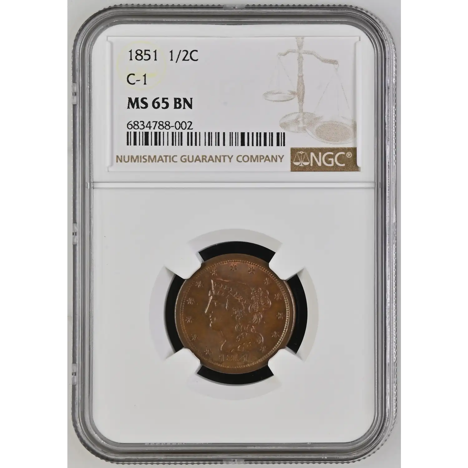 1851 Half Cents Braided Hair 1840 - 57 NGC MS-65 BN BEAUTIFUL COLOR C-1 CAC