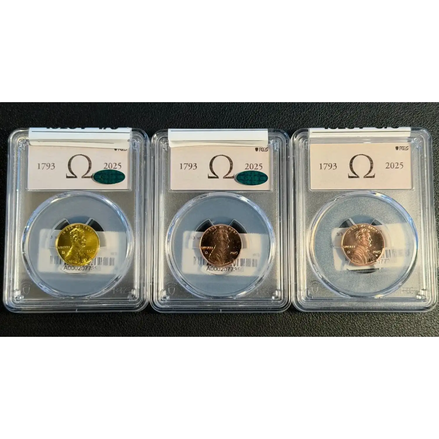 2025 1C 24-Karat Gold Cent Omega Privy CAC 3 Coin Set...MS69 CAC, MS65 CAC, MS66 with COA