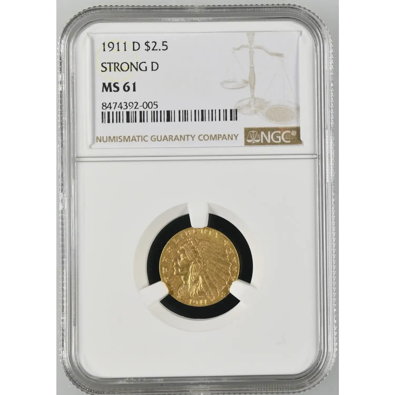 1911-D Gold Quarter Eagles $2 1/2 Indian Head NGC MS-61 STRONG D
