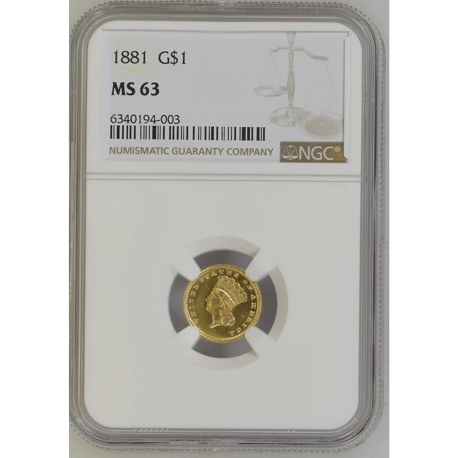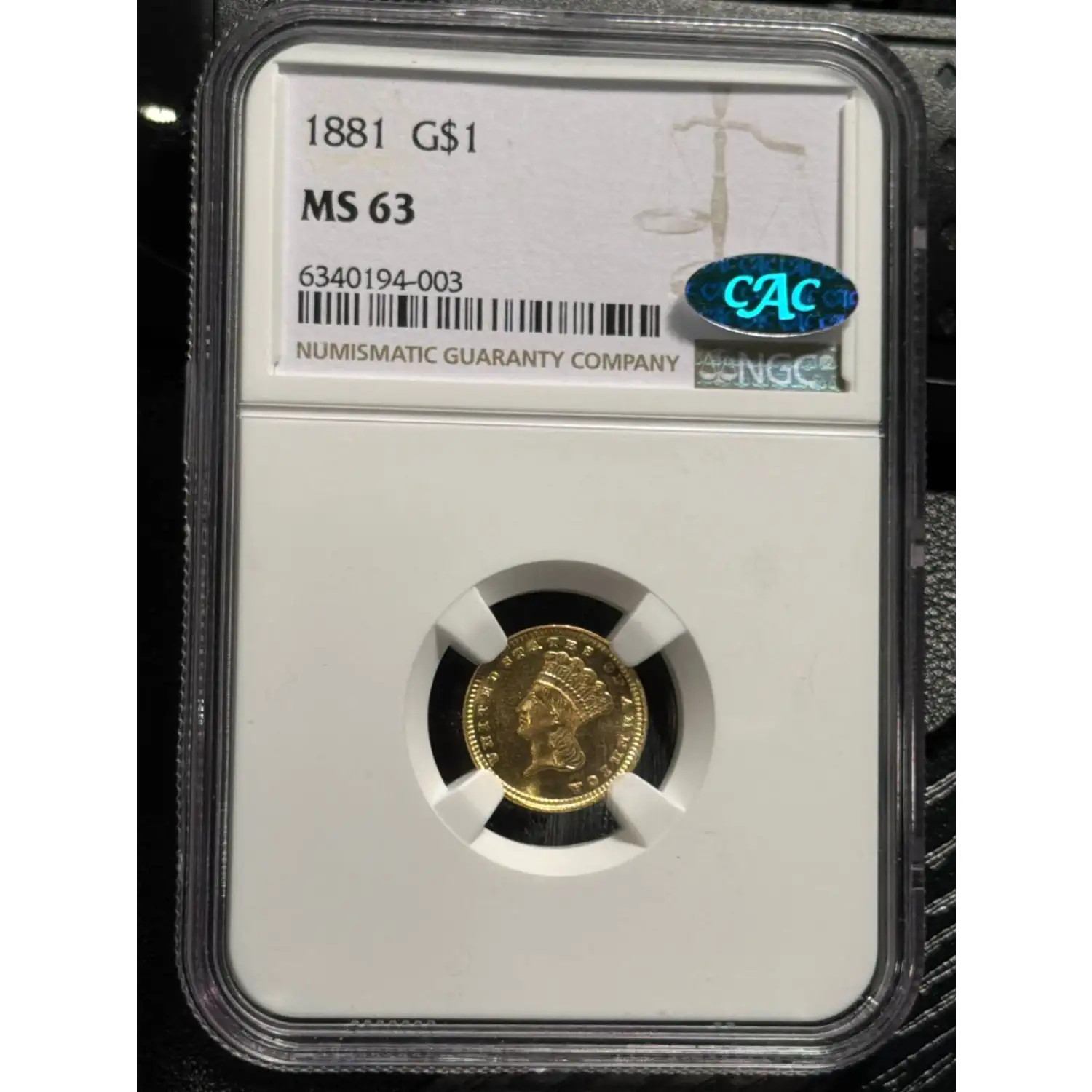 1881 Indian Princess Large Head Gold Dollar NGC MS-63 LOOKS PROOFLIKE CAC
