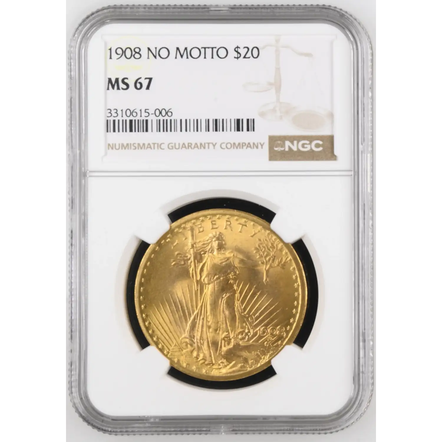 1908 Saint Gaudens Double Eagle NGC MS-67 NO MOTTO