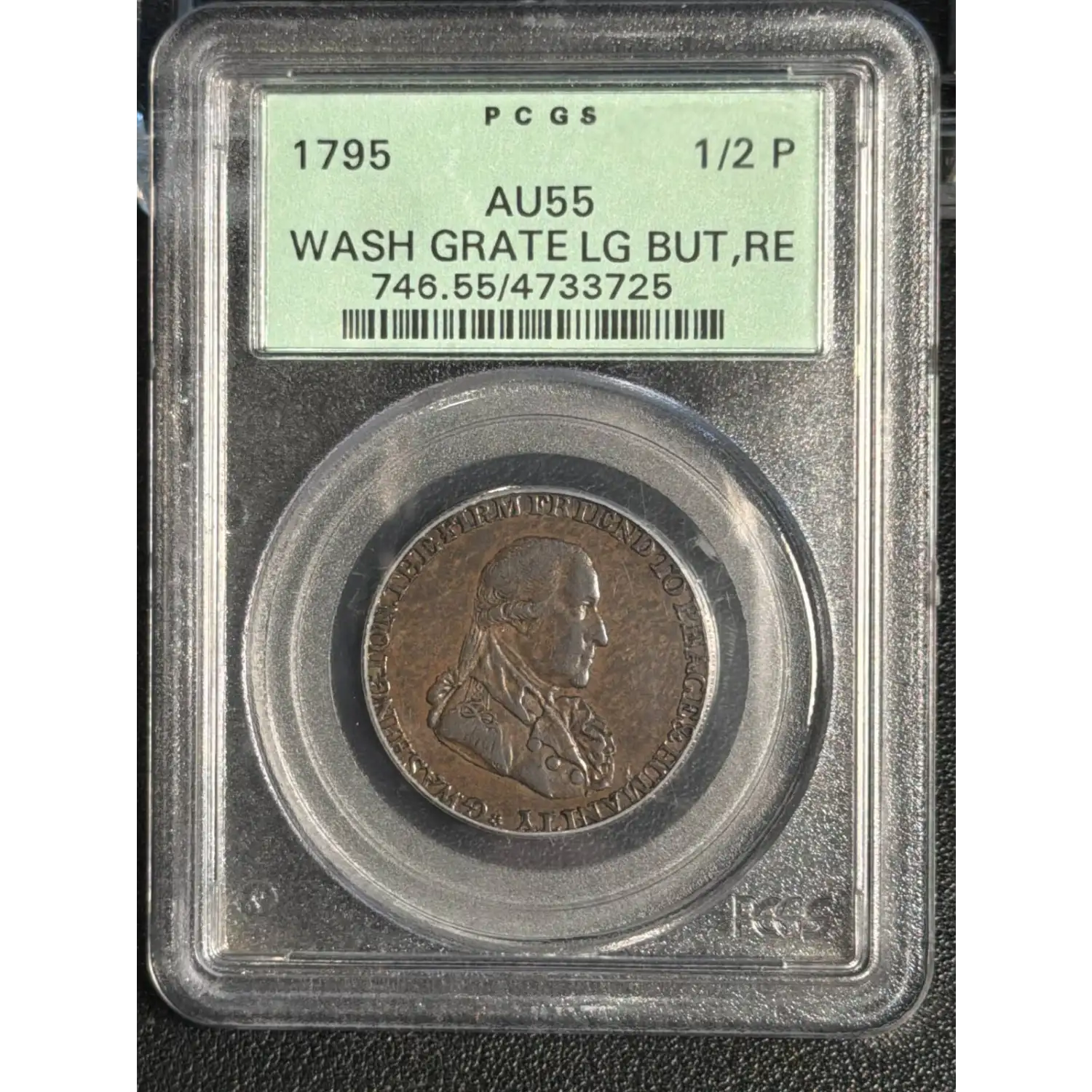 1795 Post Colonial Issues Washington Portrait Pieces - Copper Halfpenny PCGS AU-55 BN OGH PQ Wash Grate, Large Buttons, Lettered Edge