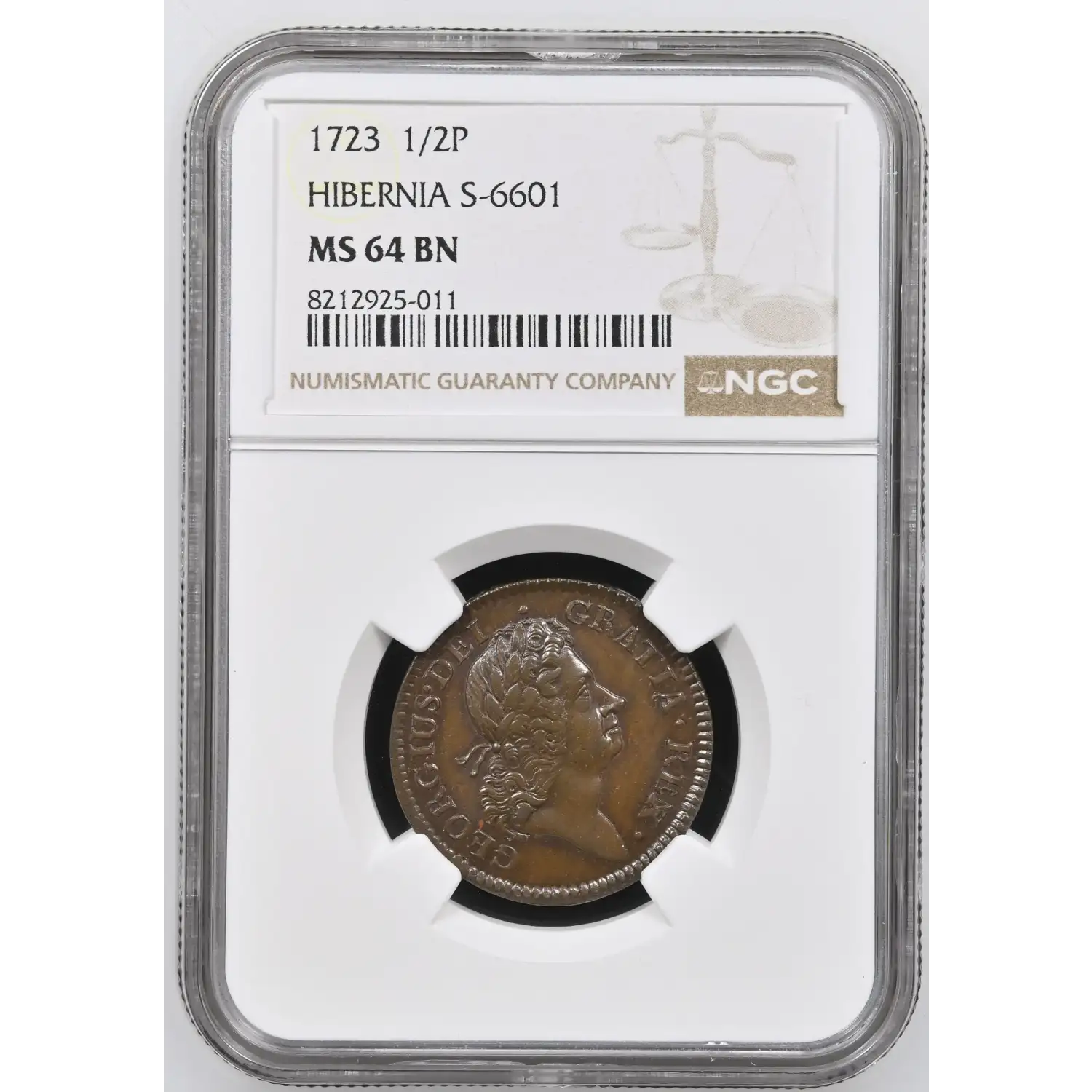 1723 Colonial Wood’s Hibernia Halfpenny NGC MS-64 BN BLAZING LUSTER HIBERNIA S-6601